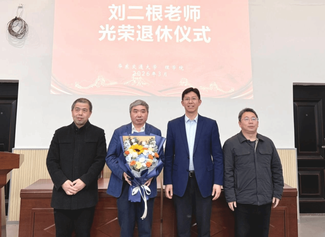 3月12日,我院为深耕教育一线三十四载的刘二根教授举办荣休仪式。华东交通大学副校长兼理学院院长刘志敏、理学院党委书记吴效葵、理学院副院长聂文杰及教师代表齐聚一堂,共同回顾刘二根教授三十四载深耕教育一线的执教生涯,感念他为学院发展与人才培养作出的突出贡献。