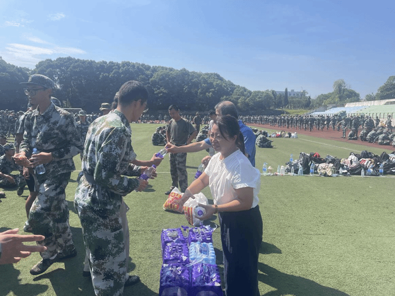 随后,书记们亲手将矿泉水、面包递到新生手中。拿到物资的新生们脸上洋溢着开心的笑容,纷纷道谢。休息时,他们围坐在一起,分享着手中的食物与水,交流着军训的心得,原本因训练而有些疲惫的脸上,此刻满是温暖与振奋。不少新生表示,在炎热的天气里收到学院的关怀,心里特别温暖,也更有信心和动力坚持下去,不辜负学院的期望。