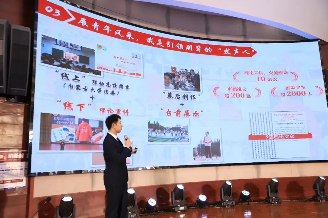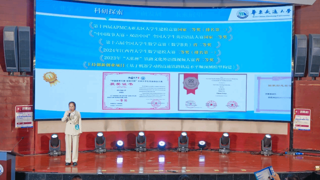 01现场风采:多维展示青年担当评选现场,丁一在风采展示与选题作答环节中,系统介绍了自己在专业学习、科研竞赛、公益实践及文化传承等领域的实践成果,展现出华交学子的自信风采与责任担当。综合评委专业打分和赛前赴泰豪集团交流实践表现评定,丁一同学最终荣获华东交通大学2024年度 “泰豪之星・十佳大学生” 称号。